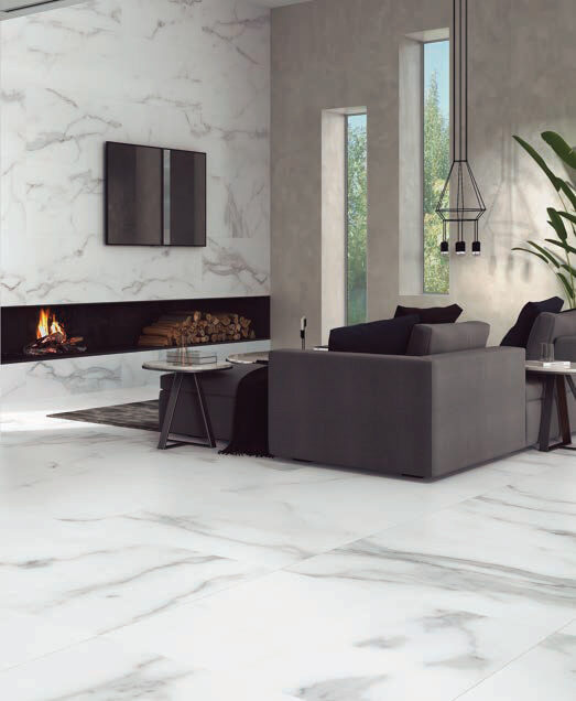 • Salón con azulejos porcelánicos vitacer advanceP.e. advance white 60x120 rect. s&g
